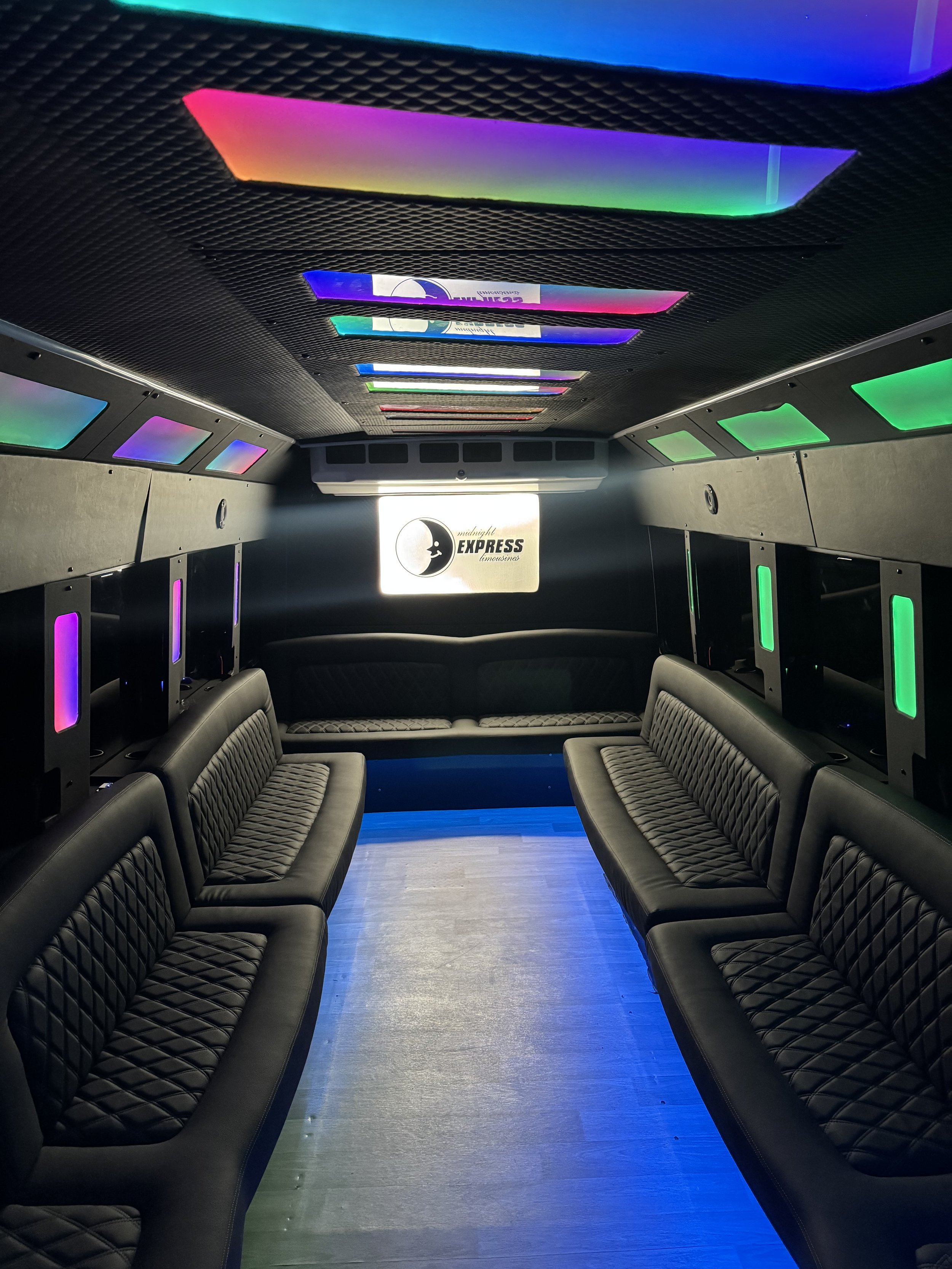All of our party buses are equipped with tvs, music with blue tooth capabilities and fun, colourful LED lights to add to the ambience of your experience. Alcoholic beverages are allowed on board as long as everyone is 21 or older. We will supply the ice, cups, and napkins. We can also supply certain mixers for a fee. We do allow food to be brought on board.
